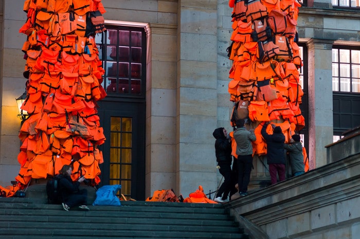 A crise envolvendo milhares de refugiados que atravessam o Mar Egeu fugindo da zona de guerra do Oriente Médio é o tema de uma polêmica instalação do artista chinês Ai Weiwei. Dessa vez ele utilizou 14.000 coletes salva-vidas, abandonados na ilha grega de Lesbos, para cobrir as colunas do Konzerthaus, em Berlim.